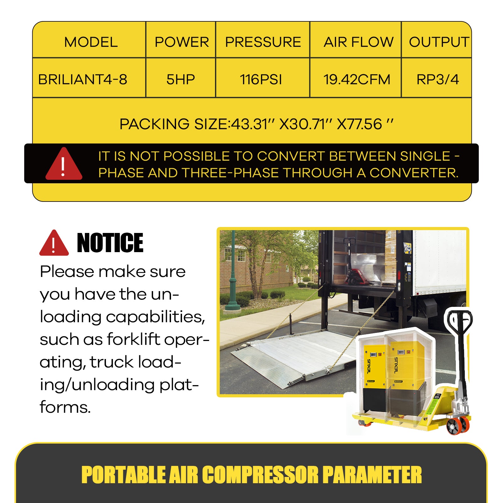 • Powerful Performance: 5.5HP/14KW motor delivers 19.43 CFM at 116PSI (8 Bar), ensuring continuous industrial-grade operation.