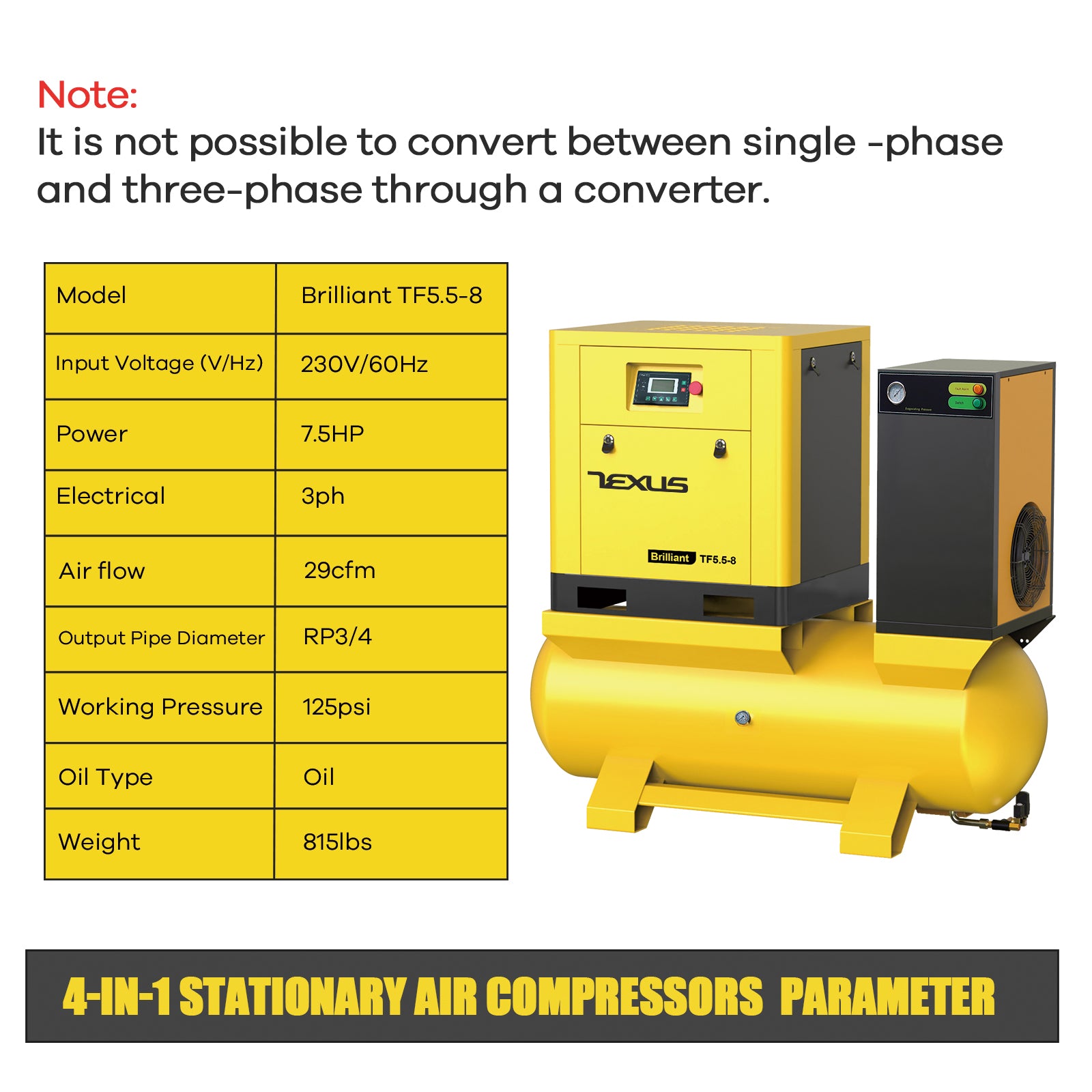 TF Series 7.5HP 5.5KW TEXUS Screw Air Compressor | 29CFM @ 116PSI | 230V 3-Phase 60Hz | RP3/4" | VSD